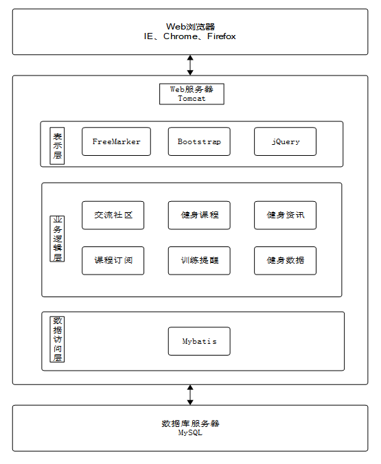 系统由表现层、业务逻辑层、数据访问层和数据库服务器组成。表现层通过浏览器(如IE、Chrome、Firefox)与用户交互,采用FreeMarker、Bootstrap、jQuery等技术实现界面呈现。业务逻辑层负责处理系统的核心业务逻辑,通过分模块设计实现功能分离。数据访问层使用MyBatis框架连接数据库,执行数据的增删改查操作。数据库服务器采用MySQL进行数据存储和管理,为系统提供稳定的数据库支持。整个架构通过Tomcat服务器完成用户请求的接收和处理,确保系统的高效运行[8]。整个系统架构如图4-1所示。
