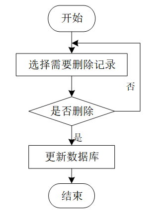 用户选择需要删除的记录后,系统判断是否确认删除。若未确认,返回选择环节;若确认删除,则更新数据库,删除对应记录,完成操作后流程结束。删除信息流程图如图3-8所示。