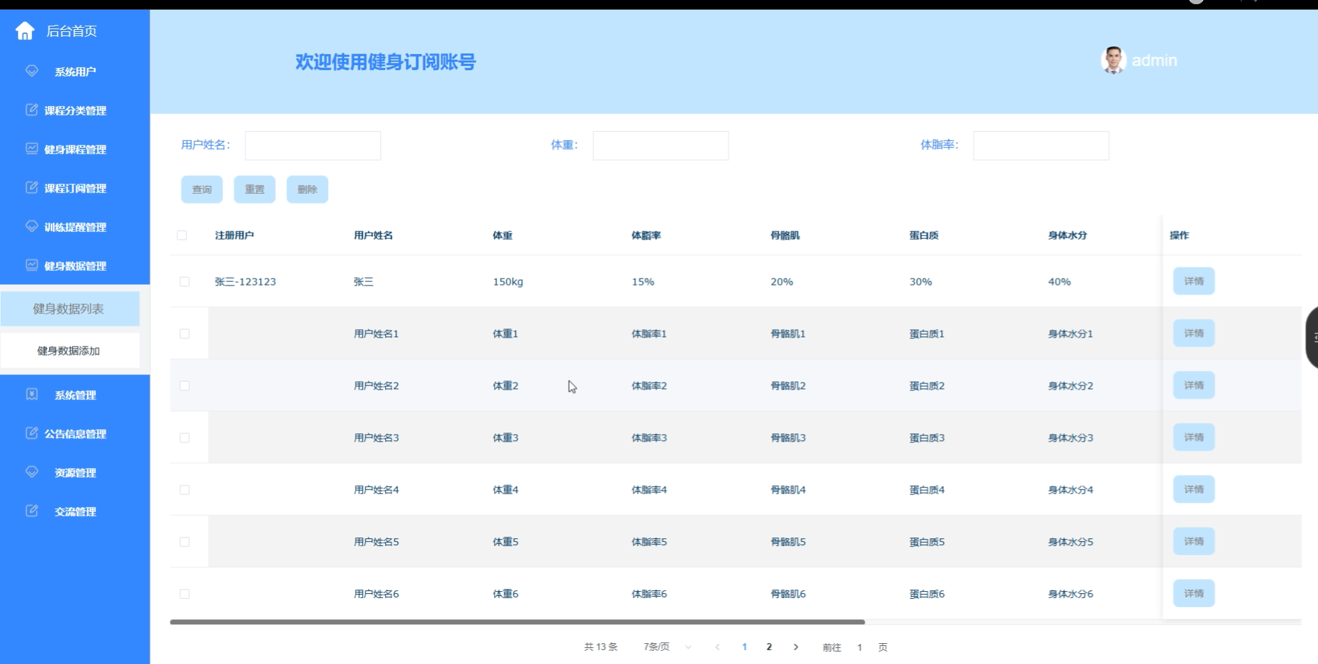 | 测试流程 | 1)管理员点击健身数据,然后点击添加后并填写信息。 2)点击进行提交。 |