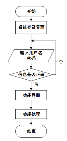用户首先进入系统登录界面,输入用户名和密码后,系统验证信息是否正确。若验证失败,返回登录界面重新输入;若验证成功,则进入功能界面,执行相应功能处理后结束操作流程。操作流程如图3-5所示。