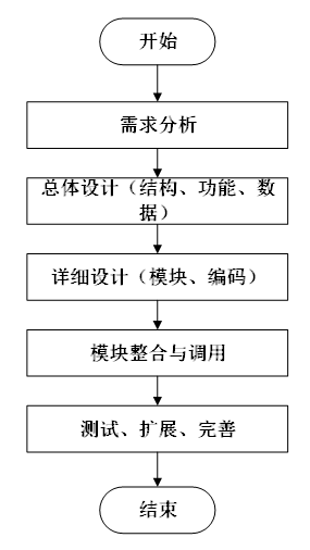 系统开发流程的主要步骤,从需求分析到系统完成的全过程。流程包括需求分析、总体设计(结构、功能、数据)、详细设计(模块、编码)、模块整合与调用,以及测试、扩展和完善,最终完成系统的开发。本系统的开发流程如图3-3所示