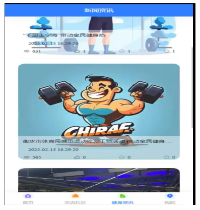 对于注册用户而言,微信小程序的设计使其能够便捷地管理自己的健身生活。在首页,用户可以查看推荐的课程、健康资讯等内容,快速找到自己感兴趣的健身项目。交流社区功能让用户能够与其他健身爱好者进行互动、分享经验,甚至提问和评论,形成一个健康、活跃的社区氛围。通过健身课程模块,用户可以浏览和订阅感兴趣的课程,进行个性化选择,提升健身效果。同时,平台还提供了丰富的健身资讯,帮助用户掌握健身、营养、健康等方面的最新动态。网站公告模块则让用户及时了解平台的更新与活动安排。在个人中心“我的”模块,用户可以查看和管理自己的健身计划与训练日程,设置提醒和收藏课程,进行健身数据分析,并追踪自己的健康状况。通过这些功能,注册用户不仅能够方便地管理自己的健身内容,还能够随时调整和优化自己的健身计划,提升参与感和健身效果。