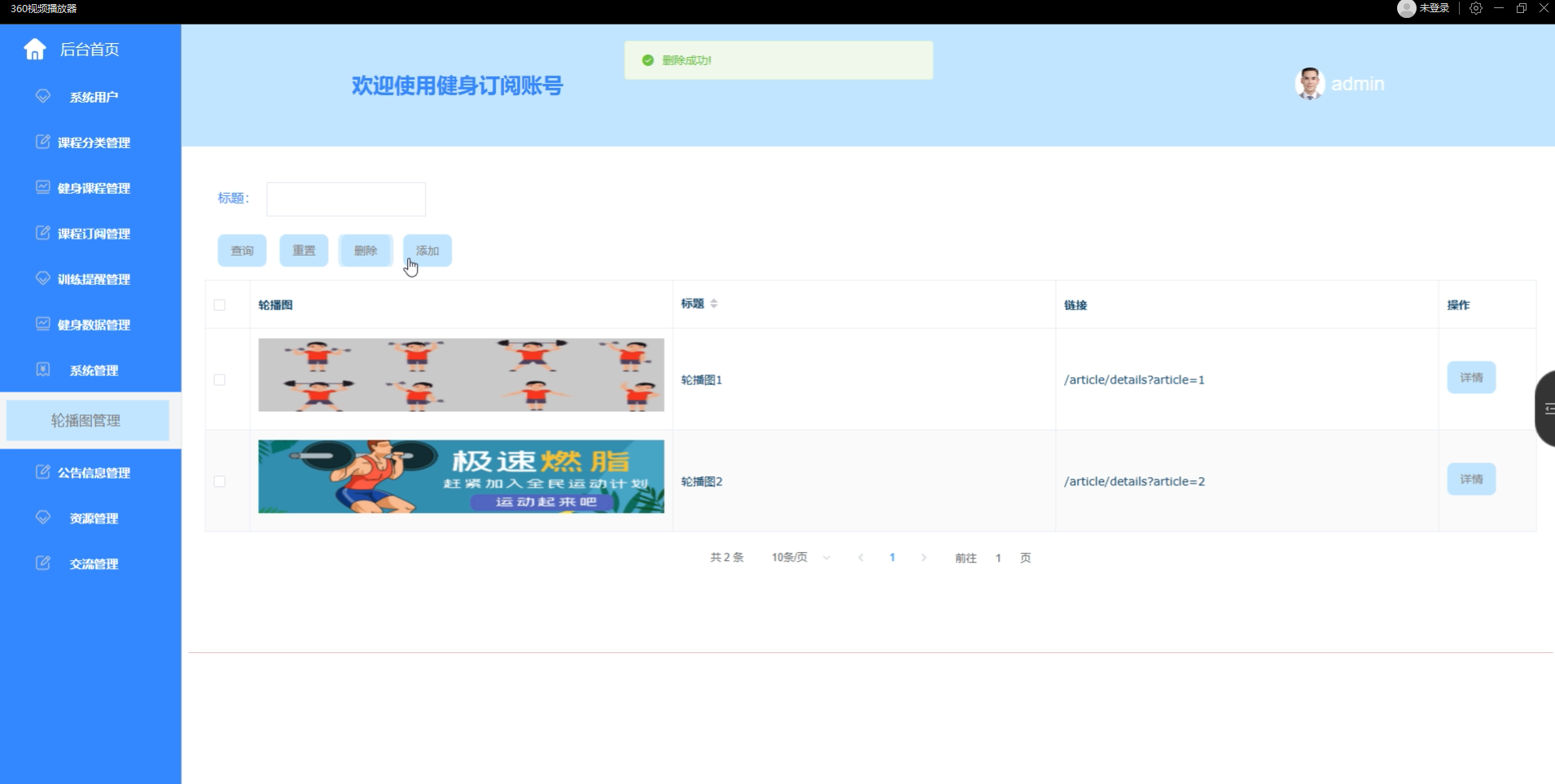 管理员点击“系统管理”菜单,可以对前台展示的轮播图进行设置,系统管理界面如下图所示。