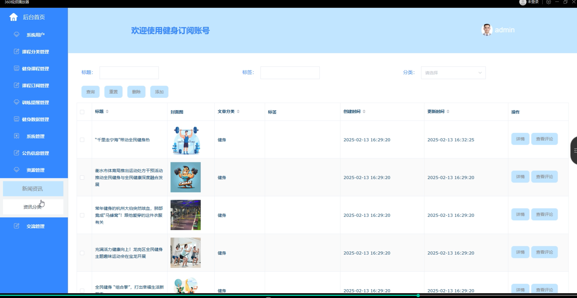 在设计过程中,系统采用SpringBoot作为后端框架,提供高效、稳定的服务支持,结合MySQL数据库存储用户数据、课程信息和健身记录等内容。前端通过微信小程序实现与用户的交互,用户可以方便地浏览课程、订阅课程、查看健身数据及参与社区交流等。同时,系统还提供了灵活的管理员管理界面,包括用户管理、课程分类、资讯发布等功能,帮助管理员高效管理平台内容和用户数据。