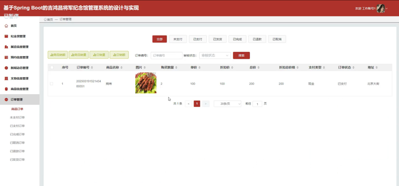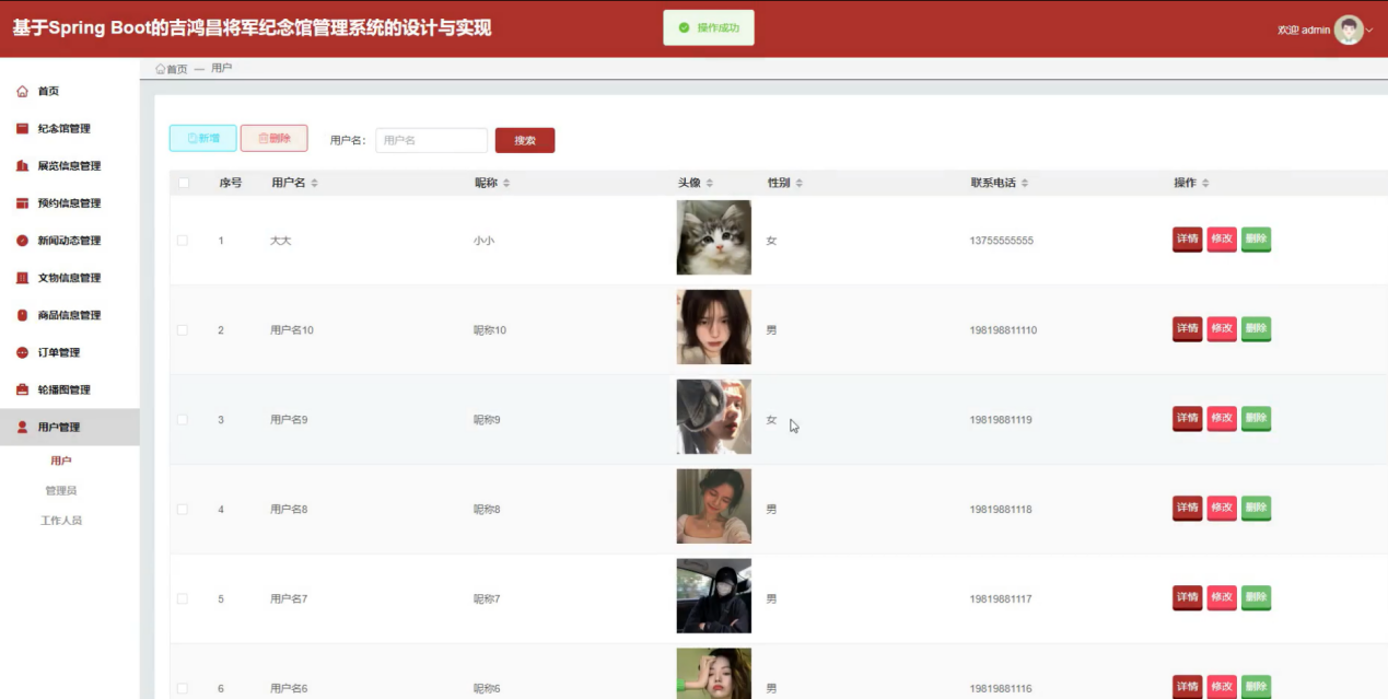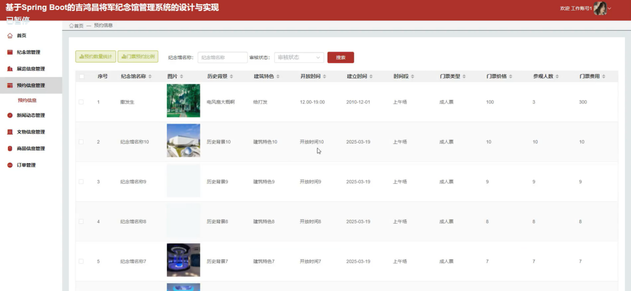 工作人员可以管理纪念馆管理、展览信息管理、预约信息管理、新闻动态管理、文物信息管理、商品信息管理、订单管理等信息。