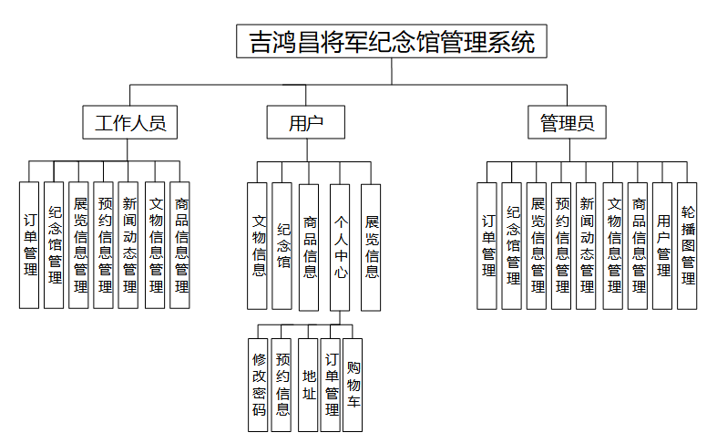 功能模块设计是系统开发过程中的重要阶段,它旨在将系统划分为不同的模块,每个模块负责完成特定的功能或任务。吉鸿昌将军纪念馆管理系统 由多个功能模块组成,每个模块下又包含具体的功能操作。系统功能结构图如图4-6所示。