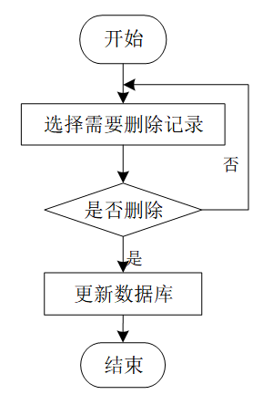 用户选择需要删除的记录后,系统判断是否确认删除。若未确认,返回选择环节;若确认删除,则更新数据库,删除对应记录,完成操作后流程结束。删除信息流程图如图4-5所示。