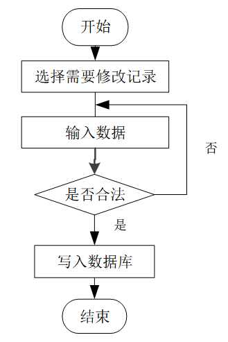 用户首先选择需要修改的记录,输入修改后的数据,系统判断输入数据是否合法。若数据不合法,提示重新输入;若数据合法,则将修改后的数据写入数据库,完成操作后流程结束。修改信息流程图如图4-4所示。