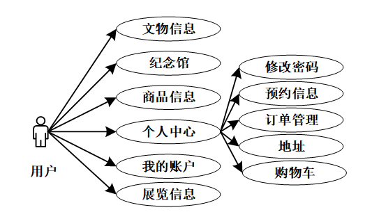 用户可以浏览文物信息、纪念馆、商品信息、展览信息、个人信息(修改密码、预约信息、订单管理、地址、购物车)等信息。