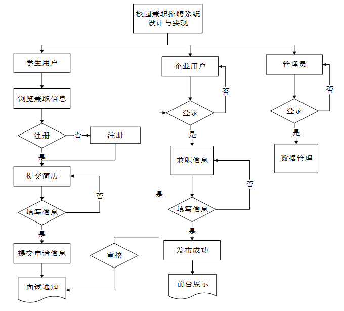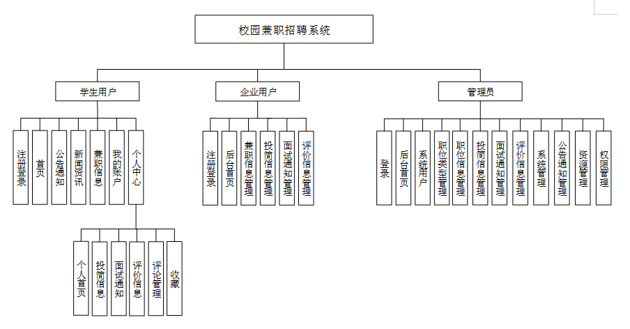 按照校园兼职招聘系统的角色,系统划分为了学生用户模块、企业用户模块和管理员模块这三大部分。