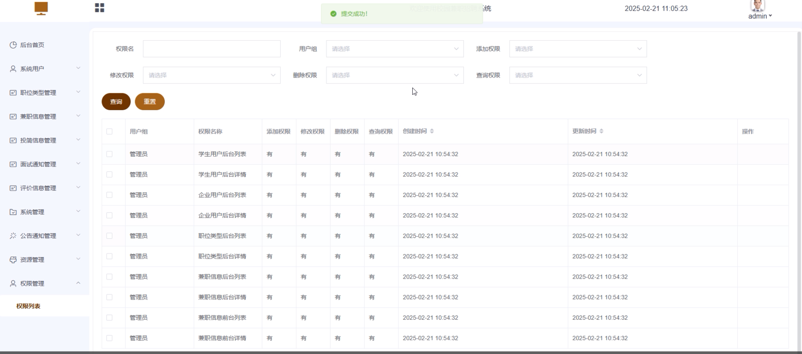 职位类型管理:管理员可以添加、编辑和删除职位类型,确保平台上的兼职职位分类清晰、准确,方便用户快速找到相关职位。