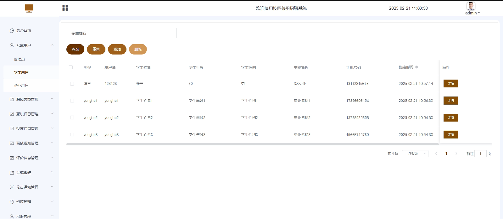 系统用户:管理员可以管理系统中的不同用户角色,包括学生用户和企业用户,支持用户信息的查看、修改和删除操作。