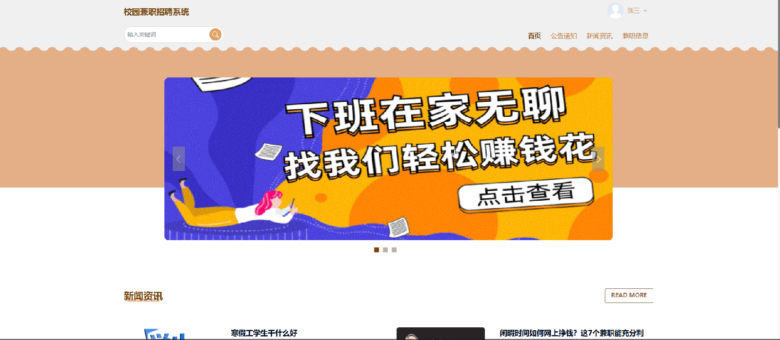 首页:包括公告通知、新闻资讯、兼职信息等主要模块的快速入口。首页还应展示最新或重要的信息,如紧急公告、热门新闻或推荐兼职,以方便学生快速获取重要信息。