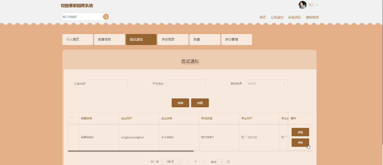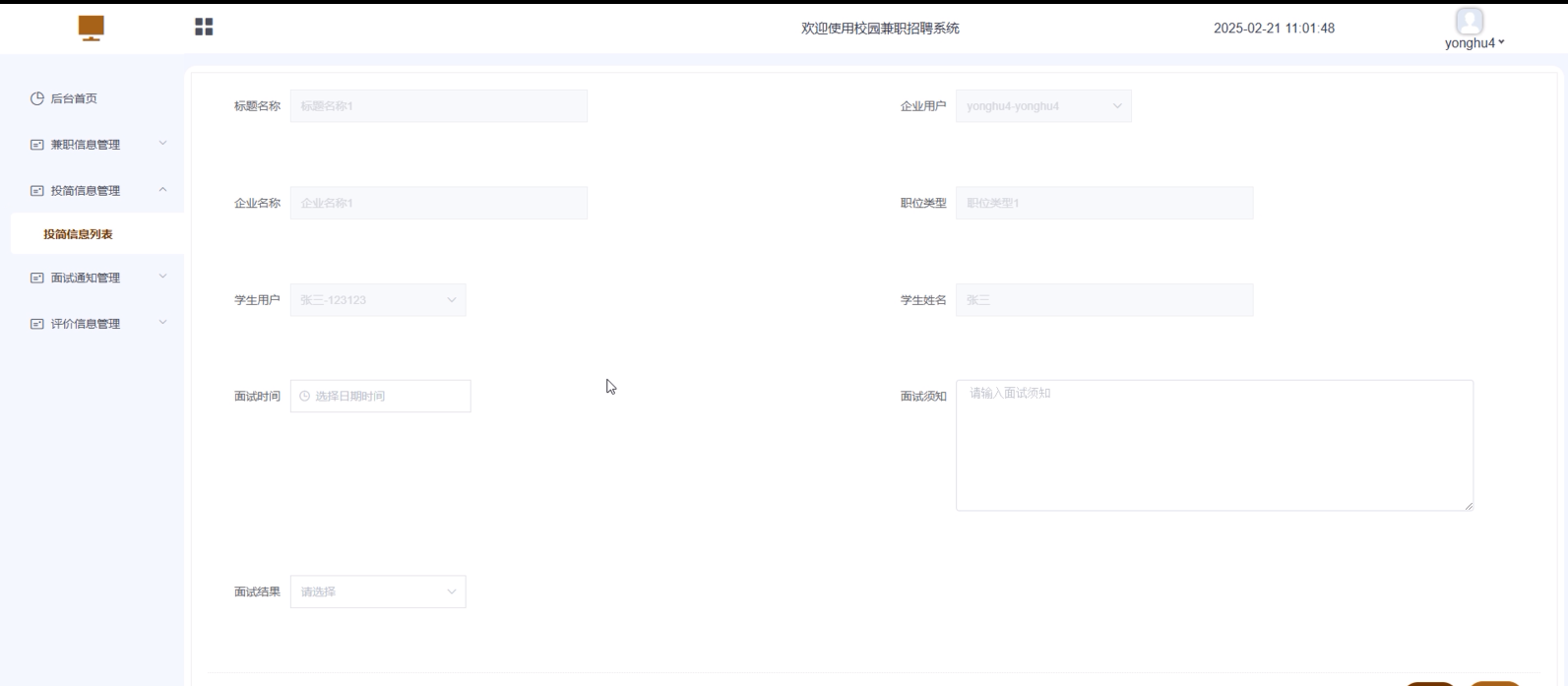 面试通知管理:管理员可以查看和管理企业发布的面试通知,确保学生和用人单位之间的信息传递及时准确。