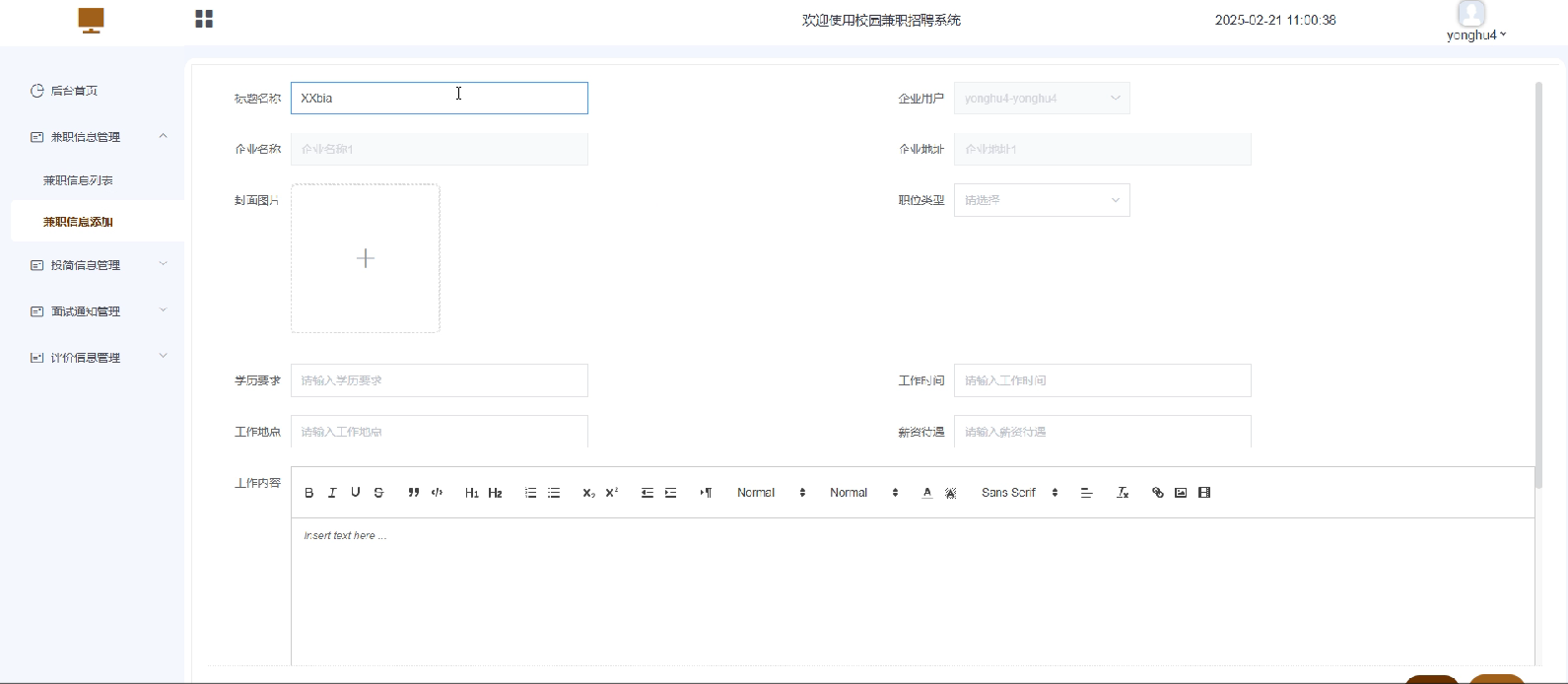 企业用户可以在兼职信息管理模块中进行兼职职位的发布、编辑和删除操作。发布兼职信息时,需要填写详细信息,如标题名称、学历要求、工作地点、工作时间、工作内容、薪资待遇等,并上传封面图片。发布的信息需要经过管理员审核,审核通过后才能在前台展示给学生用户,确保信息的准确性和合规性。发布兼职信息界面如下图5-8所示。