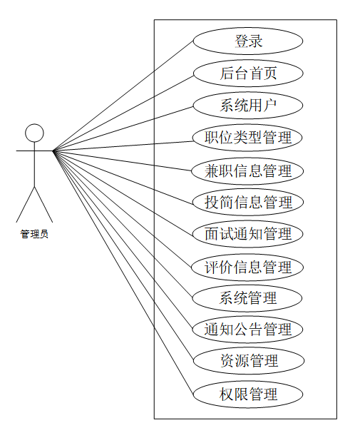 系统用例分析是对校园兼职招聘系统中各个功能模块的用户需求和行为进行分析,以识别和描述不同的用户用例。通过系统用例分析,可以深入了解用户在系统上的操作流程和交互方式,为系统设计和开发提供指导,并确保系统能够满足用户的需求和期望。校园兼职招聘系统的UML用例图如下图3-1、3-2和3-3所示。