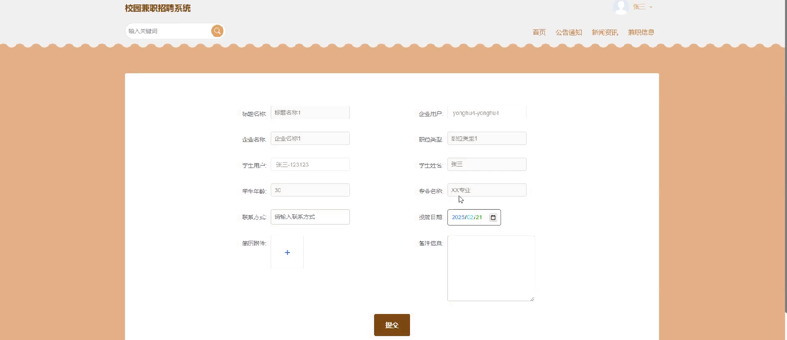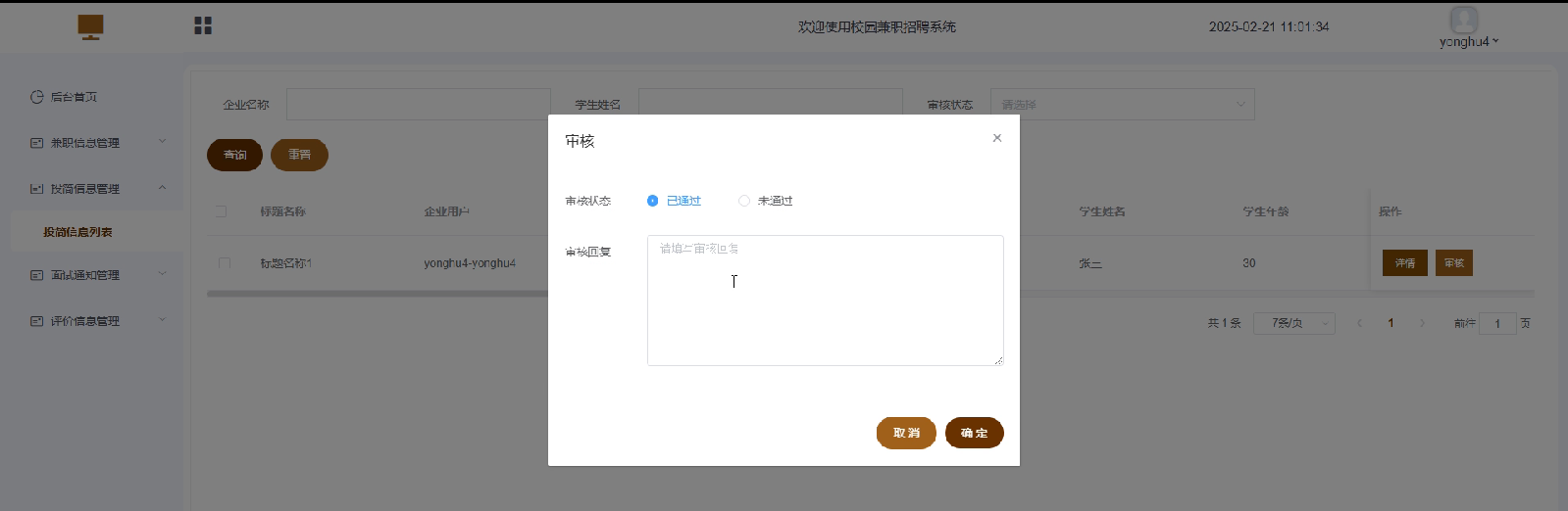 - 投简信息:列出学生投递过的所有兼职简历和申请状态。