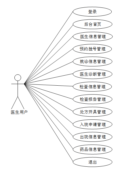 电子病历共享系统中医生用户包含注册登录、后台首页、医生信息管理、预约挂号管理、就诊信息管理、医生诊断管理、检查信息管理、检查报告管理、处方开具管理、入院申请管理、出院信息管理、药品信息管理等功能。医生用户用例图如下所示: