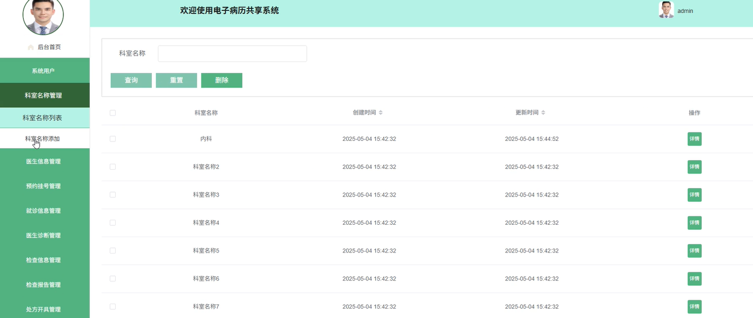 科室名称管理:包含科室名称列表和科室名称添加功能。科室名称列表:主要管理科室名称详情,支持增删改查等操作。科室名称添加:主要是添加新的科室名称数据。科室名称管理界面如下图所示。