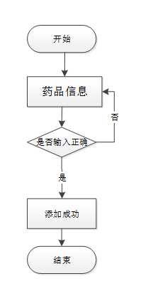 添加药品信息,输入药品名称、药品类型、药品功效等信息,并校验输入是否正确,药品信息添加流程图,如图所示: