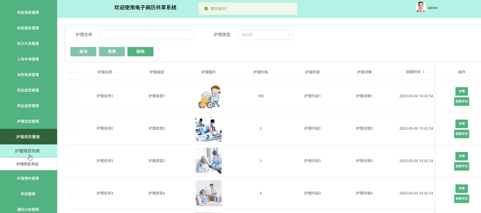 护理项目管理:包含护理信息列表和护理信息添加功能。护理项目列表:主要管理所有护理项目,支持增删改查等操作。护理项目添加:主要是添加新的护理项目数据。护理项目管理界面如下图所示。