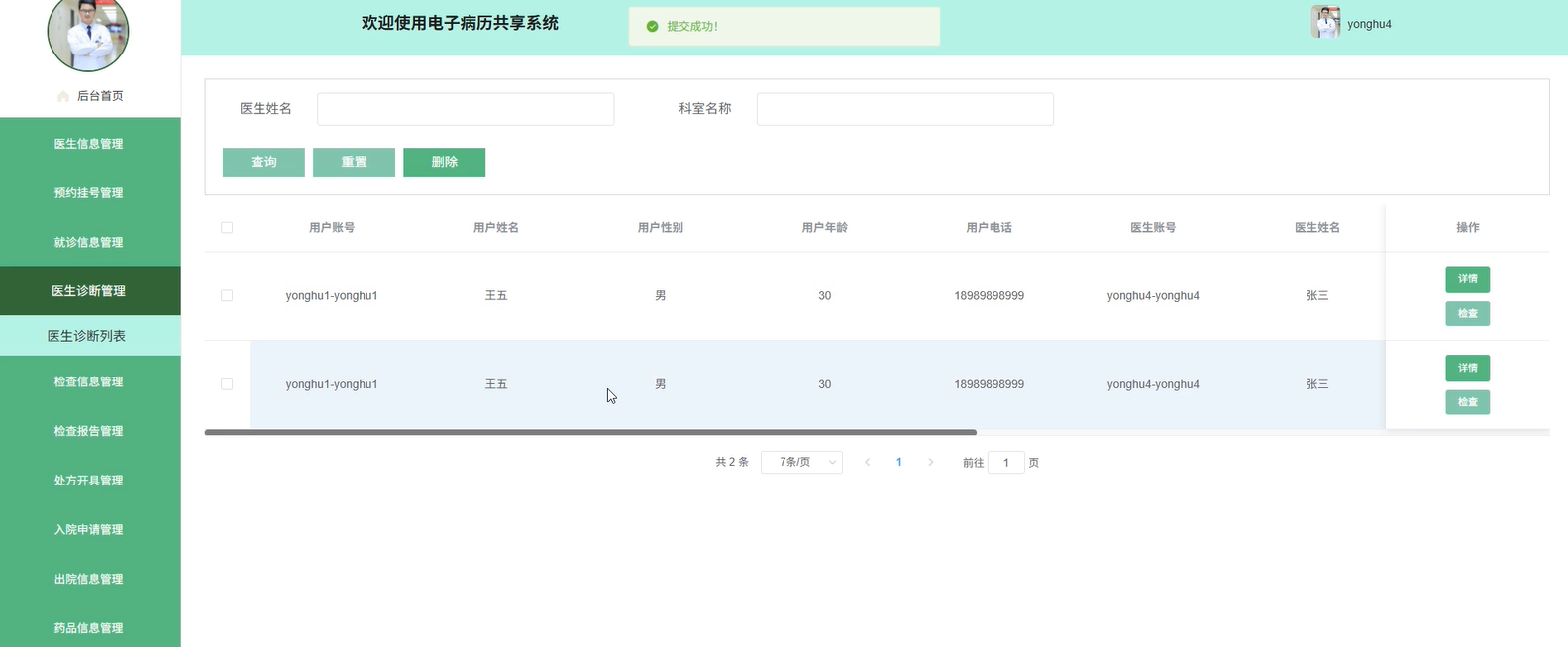 - 检查信息管理:主要展示该医生下所有用户的检查详情,支持查询、修改、删除等操作。