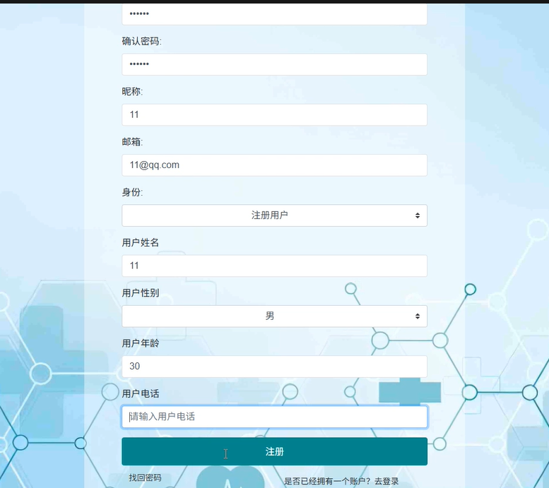 - 注册:用户点击注册,进入注册页面,填写相关账号、密码、确认密码、昵称、邮箱、用户姓名、用户性别、用户年龄、选择身份等字段信息,点击下方注册按钮,提示注册成功后,系统将自动跳转回到登录页面。