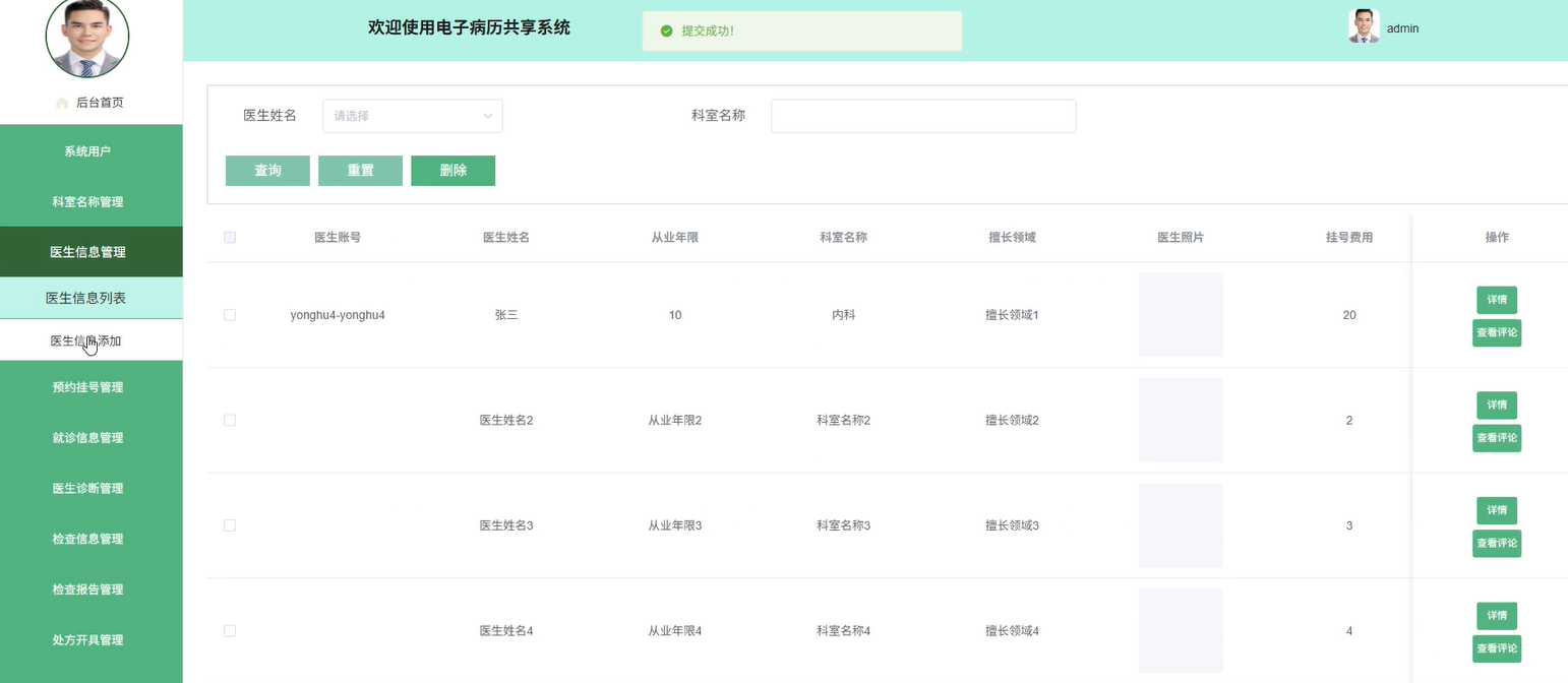 - 医生信息管理:包含医生信息列表和医生信息添加功能。医生信息列表:主要管理所有医生的医生信息详情,支持增删改查等操作。医生信息添加:主要是添加新的医生信息数据,添加的信息可在前台首页展示。