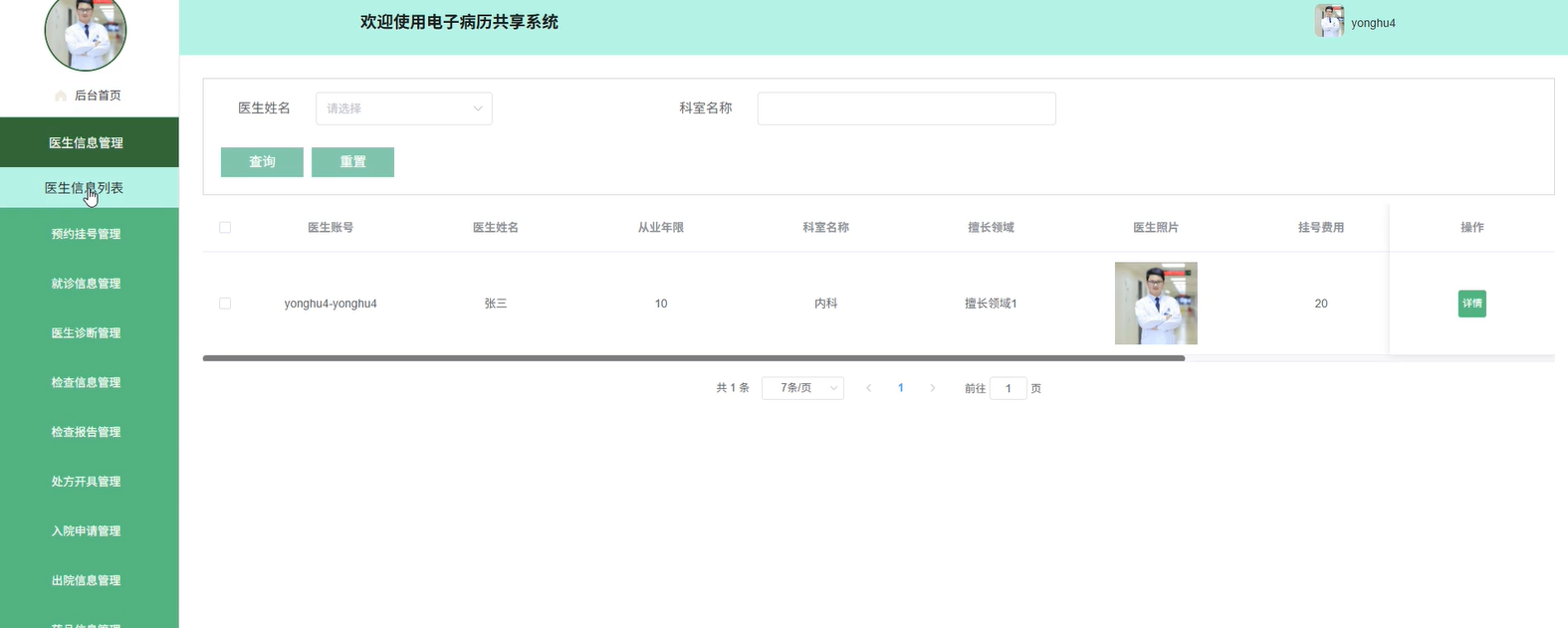 - 医生信息管理:主要展示该医生的医生信息详情,支持查询、修改等操作。