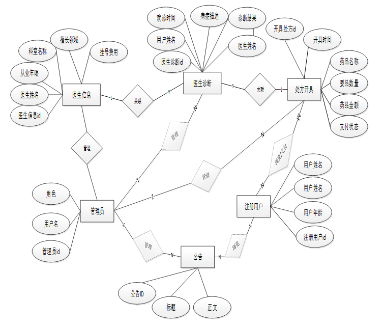 电子病历共享系统中注册用户、管理员、医生信息、医生诊断、处方开具、公告E-R实体关系图