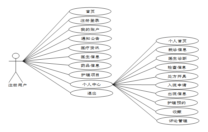 电子病历共享系统中注册用户包含注册、登录、首页、我的账户、通知公告、医疗资讯、医生信息、药品信息、护理项目、个人中心等功能。注册用户用例图如下所示: