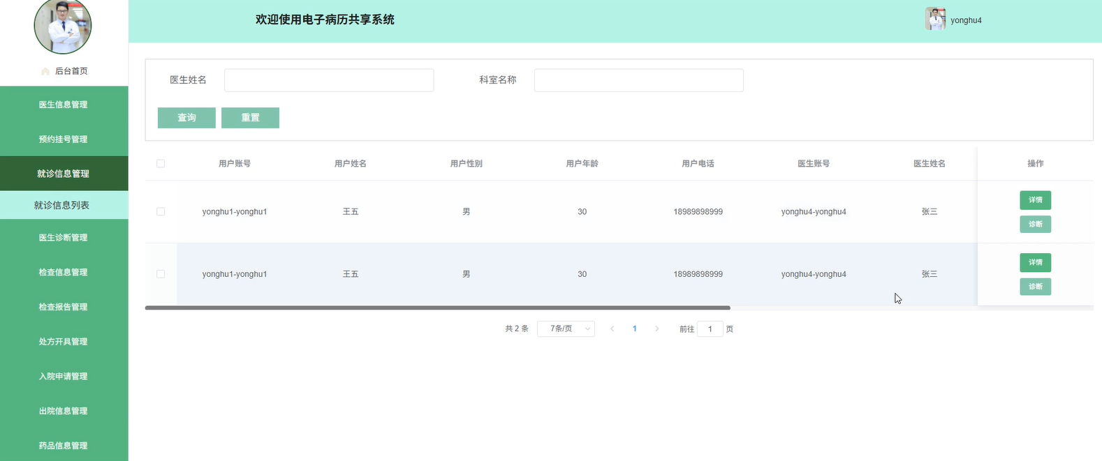 - 就诊信息管理:主要展示该医生下所有用户的就诊信息详情,支持查询、修改等操作。