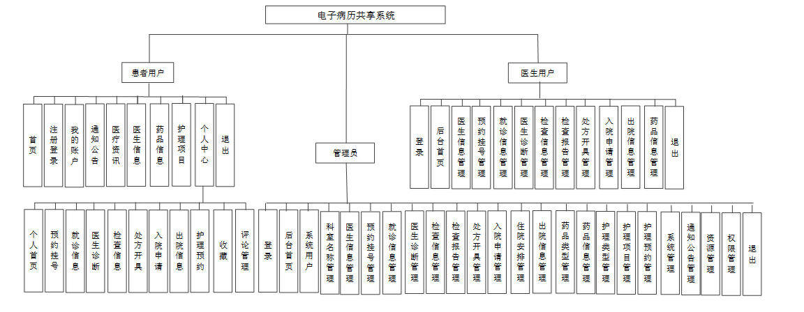 电子病历共享系统主要涉及有注册用户、医生用户和管理员三个角色,每个角色对应的功能模块如图4.1所示。