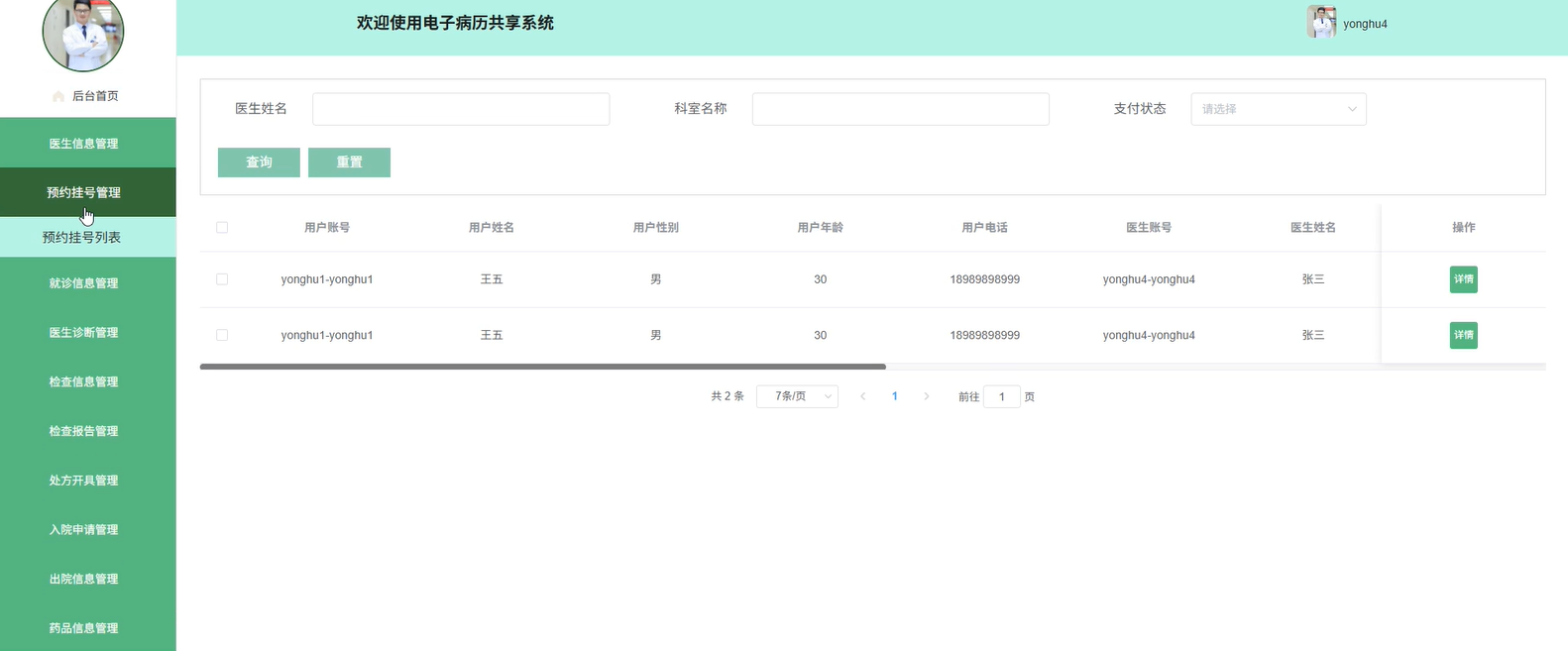 - 预约挂号管理:主要展示该医生下所有用户的预约挂号详情,支持查询、修改等操作。
