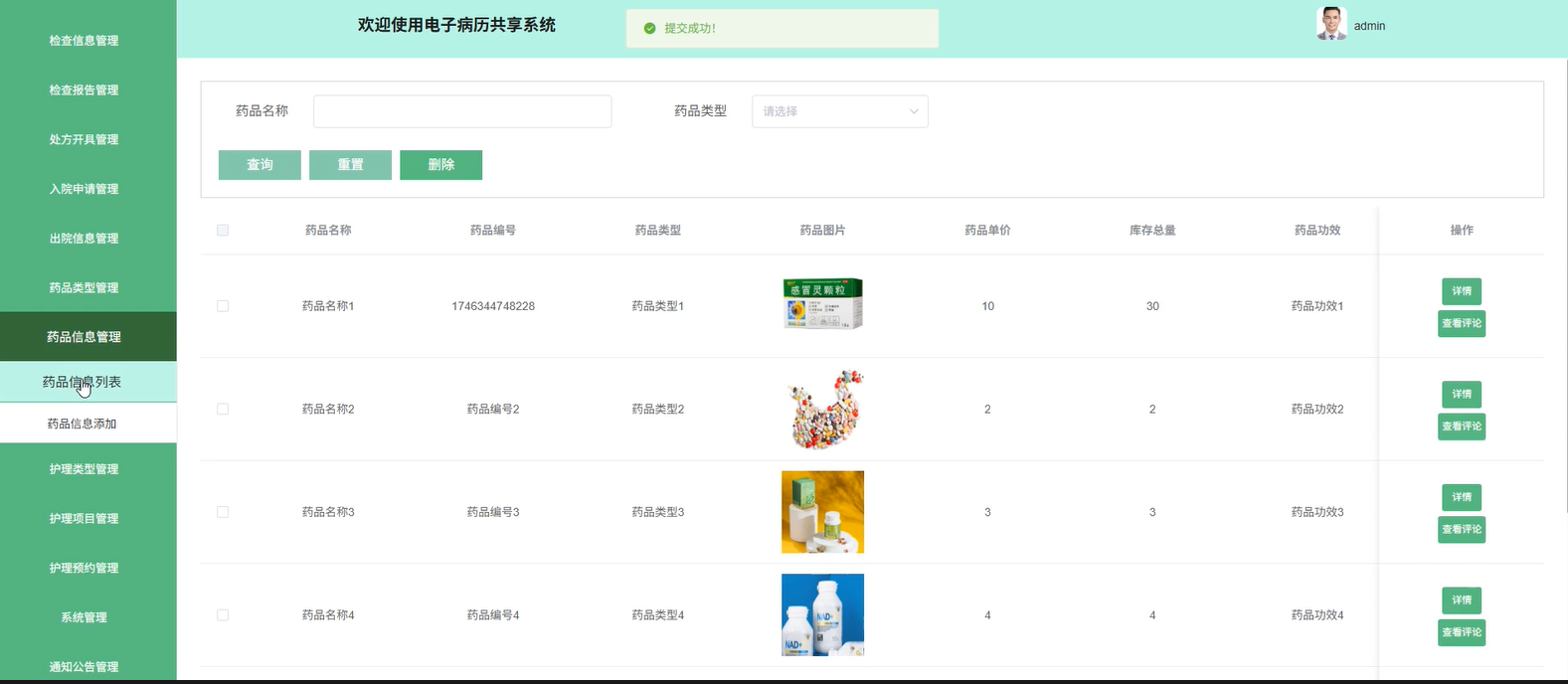 - 药品信息管理:包含药品信息列表和药品信息添加功能。药品信息列表:主要管理所有药品信息,支持增删改查等操作。药品信息添加:主要是添加新的药品信息数据。