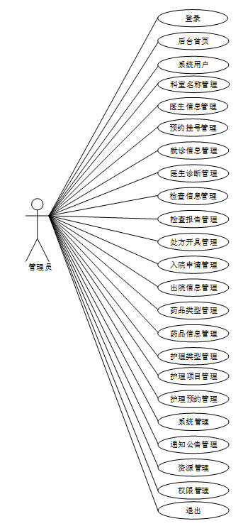 电子病历共享系统中管理员包含登录、系统用户、科室名称管理、医生信息管理、预约挂号管理、就诊信息管理、医生诊断管理、检查信息管理、检查报告管理、处方开具管理、入院申请管理、出院信息管理、药品类型管理、药品信息管理、护理类型管理、护理项目管理、护理预约管理、系统管理、通知公告管理、资源管理、权限管理等功能。管理员用例图如下所示: