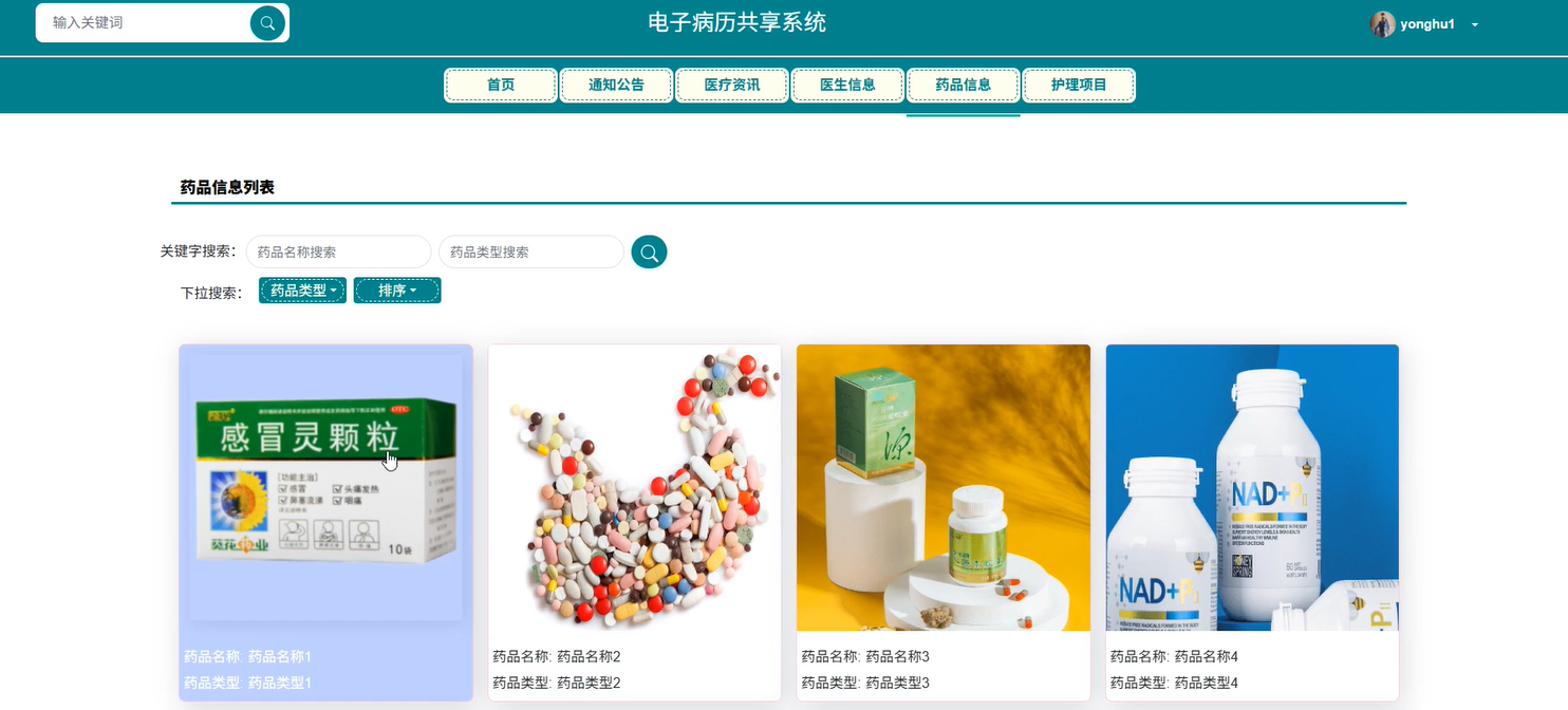- 药品信息:主要展示后台发布的药品信息,点击信息可点赞、收藏、发表评论等操作。