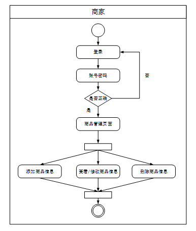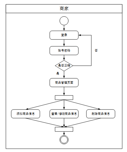 商家登录成功,便能对商品信息执行管理,此时系统前端就会显示出商品管理页面,而且从数据库中查询商品信息,商家可以自行选择是否增添新的商品信息,也可浏览并修改已有的商品信息,还可以删除不必要的商品信息。 商家对商品信息实施管理以后,可以选择保留修改,如果商家选择保留修改,系统前端就会把修改提交给系统后端,系统后端会把更新过的信息存进数据库,如果商家不选择保留修改,系统前端就会回到商品管理页面,商家可以继续管理其他商品信息。商家管理商品信息的活动图如图3-7所示。