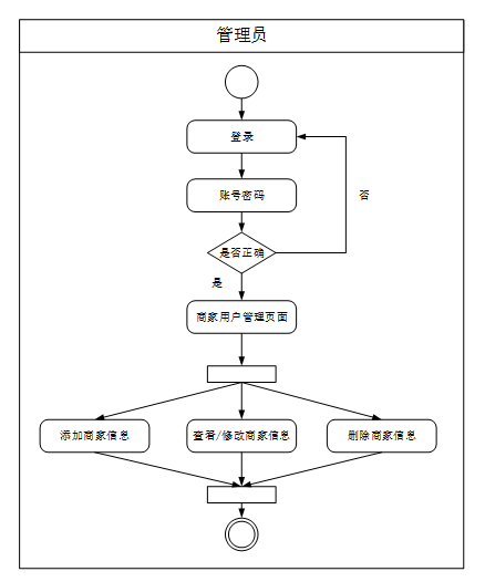 管理员登录成功以后,就能够管理商家信息,这时系统前端会显示商家管理页面,并且从数据库中调取商家信息,管理员可以选取增加新的商家信息,查看或者更改已有的商家信息,也可以删除商家信息。管理员对商家信息实施管理之后,可以选择是否保存所做出的修改,倘若管理员选择保存修改,那么系统前端就会把所做的修改传递给系统后端,后端会把修改过的商家信息存入数据库,如果管理员没选保存修改,系统前端就会再次显示商家管理页面,管理员就能接着去管理其他商家的信息。管理员管理商家信息的活动图如图3-9所示。