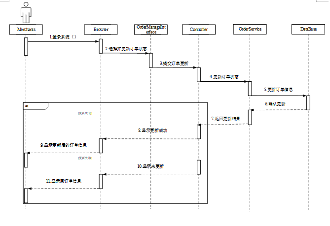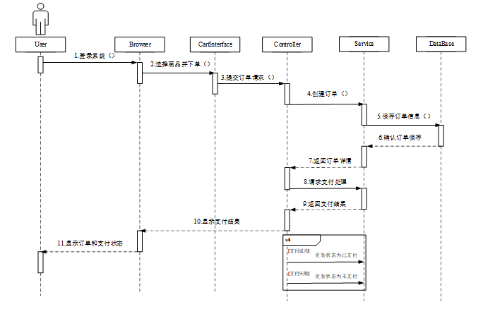 顺序图是一种展现对象间交互动态的图表,按照时间顺序详细描述了对象间的通讯过程。鉴于篇幅,本文将重点阐述用户购买商品、投诉反馈和管理员管理订单三个用例的顺序图。