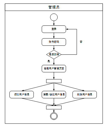 管理员登录成功之后,就能够执行用户信息管理,系统前端表现用户管理页面,并且从数据库中查询用户信息,管理员可以选择增添新的用户信息,查阅或者更改已有的用户信息,也可以删掉用户信息。 管理员对用户信息实施管理,若管理员决定保存修改,那么系统前端就会把修改发送到系统后端,而后端会把更新过的信息存进数据库当中,倘若管理员未选保存修改,系统前端便回到用户管理页面,管理员就能接着去管理其他用户的资料。管理员管理用户信息的活动图如图3-8所示。