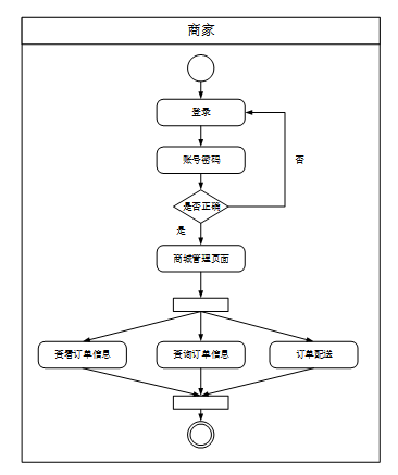 商家登录成功之后,可以浏览商城管理页面,可以查阅订单信息,系统前端显示了订单列表,还会从数据库里查询订单信息,商家选取想要处理的订单,就可以查阅订单详情,商家查阅订单信息之后,可以决定要不要执行订单配送,如果商家决定配送,那么系统前端就会把配送信息发送给系统后端,后端再把这些信息存入数据库;如果商家没有选配送,系统前端就会返回到订单列表界面。商家管理商城订单活动图如图3-6所示。