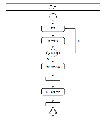 用户登录成功以后,可浏览通知公告页面,系统前端显示公告列表,并且向数据库查询公告信息,用户选取感兴趣的公告,进而查看公告的详细信息,用户查看完公告的详细信息以后,便可自行选择是否执行操作,倘若用户想要执行操作,系统前端就会把用户的请求发送给系统后端,系统后端再对这些请求信息加以处理,如果用户没有要执行的操作,系统前端就会返回公告列表,用户就可以继续浏览其他公告信息,直至结束整个查阅公告信息的过程。用户查看公告活动图如图3-1所示。