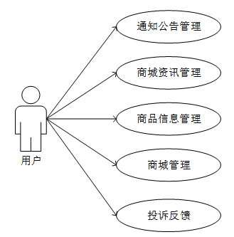 系统提供投诉反馈、通知公告、商城资讯、商品信息以及商城管理功能。用户可以通过投诉反馈功能对商品或者服务中出现的问题或者建议进行投诉。通知公告功能可以让用户看到商城发布的通知和公告。商城资讯功能可以显示商城最新的商品信息以及最新的行业动态。商品信息功能可以让用户看到商品的详细信息。商城管理功能可以让用户查看自己的购物车以及订单信息。用户功能用例图如图3-13所示。