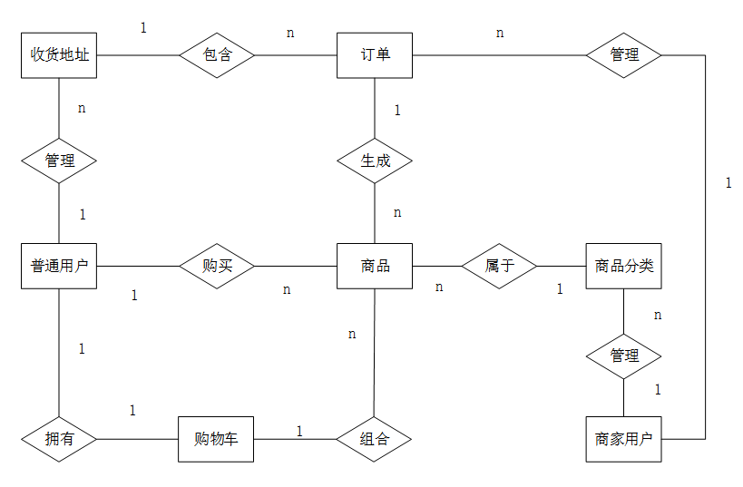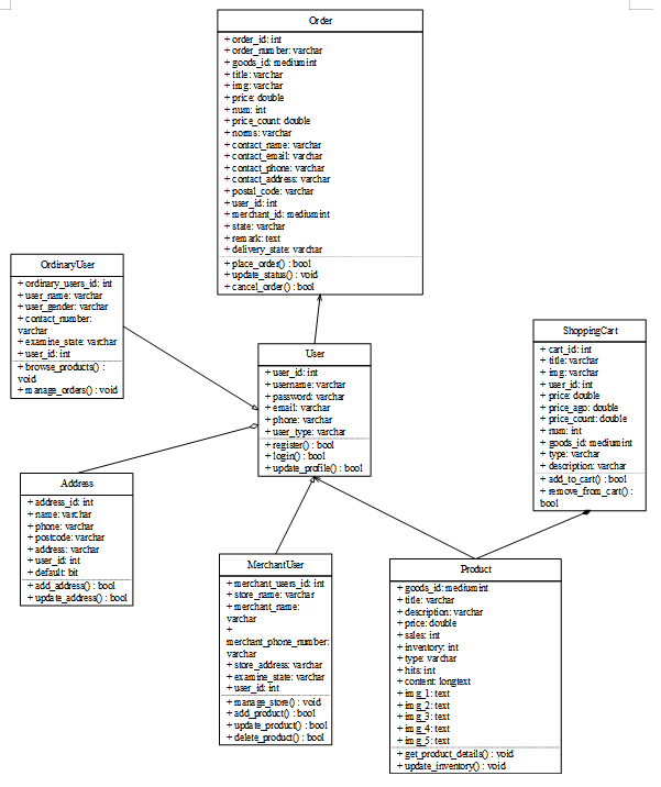 由前面的系统分析可知,断桥镇水果交易网站中有七个主要的类对象:“用户”类,“商品分类”类,“地址”类,“购物车”类,“商品”类,“订单”类以及“商家用户”类,其中用户类同地址类,购物车类,商品类,订单类之间存在关联关系,商家用户类和商品类,订单类存在关联关系,购物车类与商品类存在关联关系,订单类又与地址类存在关联关系。创建好的完整类图如图4-2所示。