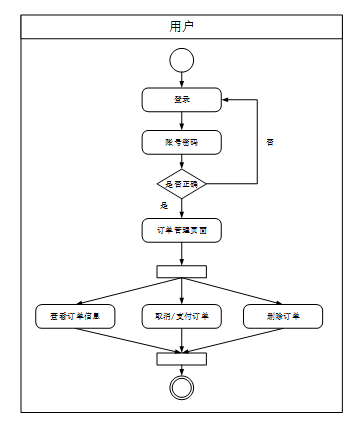 用户登录成功之后,就可以进入到订单管理页面,这时系统前端就会显示出订单列表,从数据库中查询出订单信息,用户可以点击自己感兴趣的订单,就可以查看订单信息详情,当用户查看完订单信息详情之后,就可以进行以下操作:查看订单信息、取消/支付订单、删除订单。 如果用户选择查阅订单信息,那么系统前端就会显示订单的所有信息;如果用户选择取消/支付订单,系统前端就会把用户的支付或取消命令发给系统后端,后端执行这个请求,还要更新数据库;如果用户想删掉订单,系统前端就会把用户的删除命令发给系统后端,后端就会把订单信息从数据库中删除。用户管理订单活动图如图3-4所示。