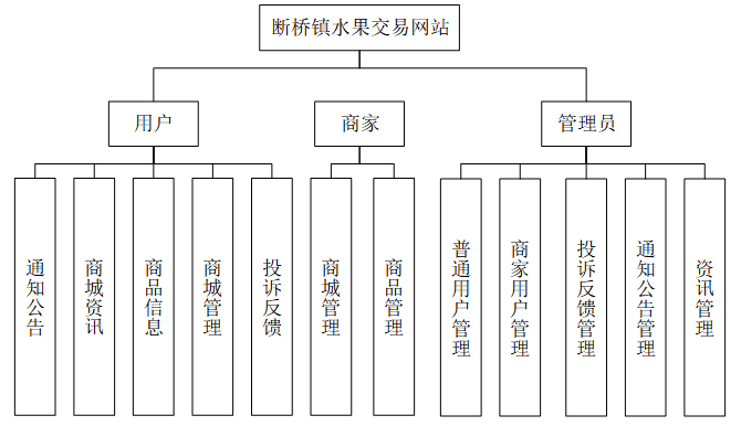 根据系统分析,断桥镇水果交易网站后台管理端设计为登录、商品管理、投诉反馈管理、通知公告管理、资讯管理等,其中管理员可以对系统的所有模块进行管理。商家端设计的功能模块有商城管理、商品管理等。用户端设计的功能模块有投诉反馈、通知公告、商城资讯、商品信息等。整个系统的功能模块设计如图4-1所示。