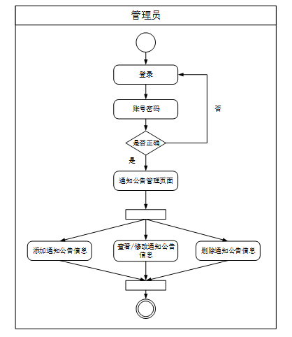 管理员登录成功以后,就能对通知公告信息展开管理,系统前端显示通知公告管理页面,并且从数据库查询通知公告信息,管理员可以选取增添新的公告信息,查阅或者更改现有的公告信息,也可以删掉公告信息。管理员对公告信息实施管理以后,可以决定保存所作的改变,如果管理员选定了保存改变,那么系统前端就会把改变递交到系统后端,后端就会把改变过的消息存入数据库之中,倘若管理员未选定保存改变,系统前端就会返回到通知公告管理页面,管理员就能够接着去管理别的公告信息。管理员管理通知公告信息的活动图如图3-11所示。
