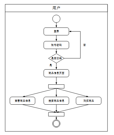用户登录成功之后,能浏览商品信息页面,系统前端显示商品信息,而且从数据库当中查询商品信息,用户可以查看商品信息,搜索商品或者购买商品,若用户选取查看商品信息,系统前端就会表现商品的详细信息,若用户搜索商品,系统前端依照用户所键入的关键词执行搜索,然后表现搜索结果,若用户选取购买商品,系统前端会引领用户步入购买流程。用户在完成查看、 搜索或者购买商品之后,可以选择浏览其他的商品信息,也可以选择退出该系统,用户完成了一次完整的浏览商品信息的活动。用户浏览商品活动图如图3-3所示。