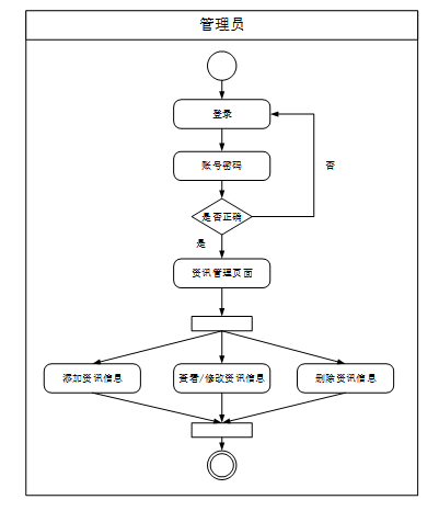 管理员成功登录系统之后,就可以对资讯信息实施管理,这时系统前端就会显示出资讯管理页面,而且还要从数据库中去查找资讯信息,管理员可以自己挑选增添新的资讯信息,也可以浏览或者修改已有的资讯信息,还可以删除资讯信息。 管理员对资讯信息执行管理操作之后,可选择是否保留修改,倘若管理员决定保留修改,那么系统前端就把修改交予系统后端,而后端就会把更新过的资讯信息存储到数据库当中,倘若管理员不保留修改,系统前端就会返回到资讯管理页面,此时管理员可继续去管理其他资讯信息。管理员管理资讯信息的活动图如图3-12所示。
